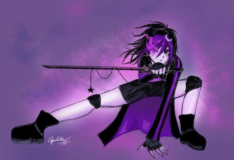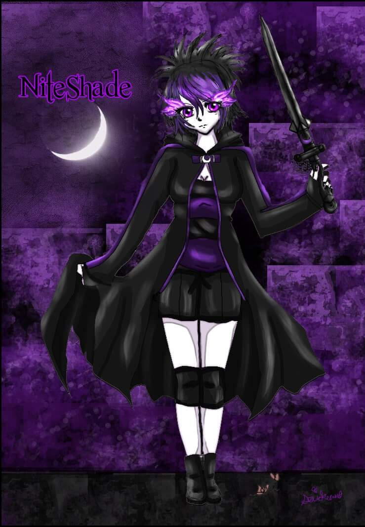 She is inspired from the anime series "Black rock shooter". A BRS version of myself. Niteshade is the name of her sword, Moonlight Shadow is her spirit name.Drawing her: